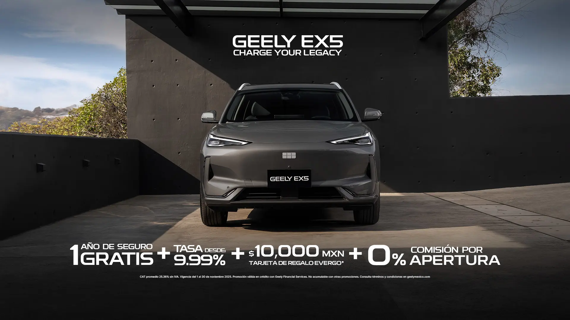 El año de seguro gratis aplica únicamente para el modelo Geely EX5 2026 en su versión GF, en operaciones de crédito a través de Geely Financial Services (BBVA). Válido solo con aseguradoras participantes. Consulta especificaciones y condiciones con tu Distribuidor autorizado Geely. Al finalizar el periodo del seguro gratis, el cliente deberá contratar un seguro conforme a lo señalado en su contrato de crédito.