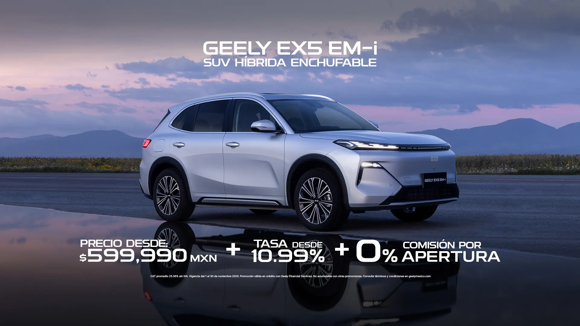 La tasa de interés aplica únicamente con el plan de crédito simple, a través de Geely Financial Services (BBVA México S.A., Institución de Banca Múltiple), para el modelo GEELY EX5 EM-i 2026 en su versión GF, a partir de un enganche de 50.00%, sobre un importe promedio a financiar de $299,995.00 MXN a un plazo promedio de hasta 72 meses y tasa de interés ordinaria fija anual sin IVA del 10.99%. Esta oferta no incluye el costo del seguro, mismo que podrá ser cubierto de contado o financiado, conforme a lo estipulado en su contrato, y no es acumulable con otras promociones. Monto de la mensualidad publicada incluye IVA e impuestos. Aplica 2.5% de comisión por apertura En plan BASE o 0% Comisión por apertura utilizando el plan BUEN FIN. No aplica seguro por un año gratis, y no es acumulable con otras promociones.