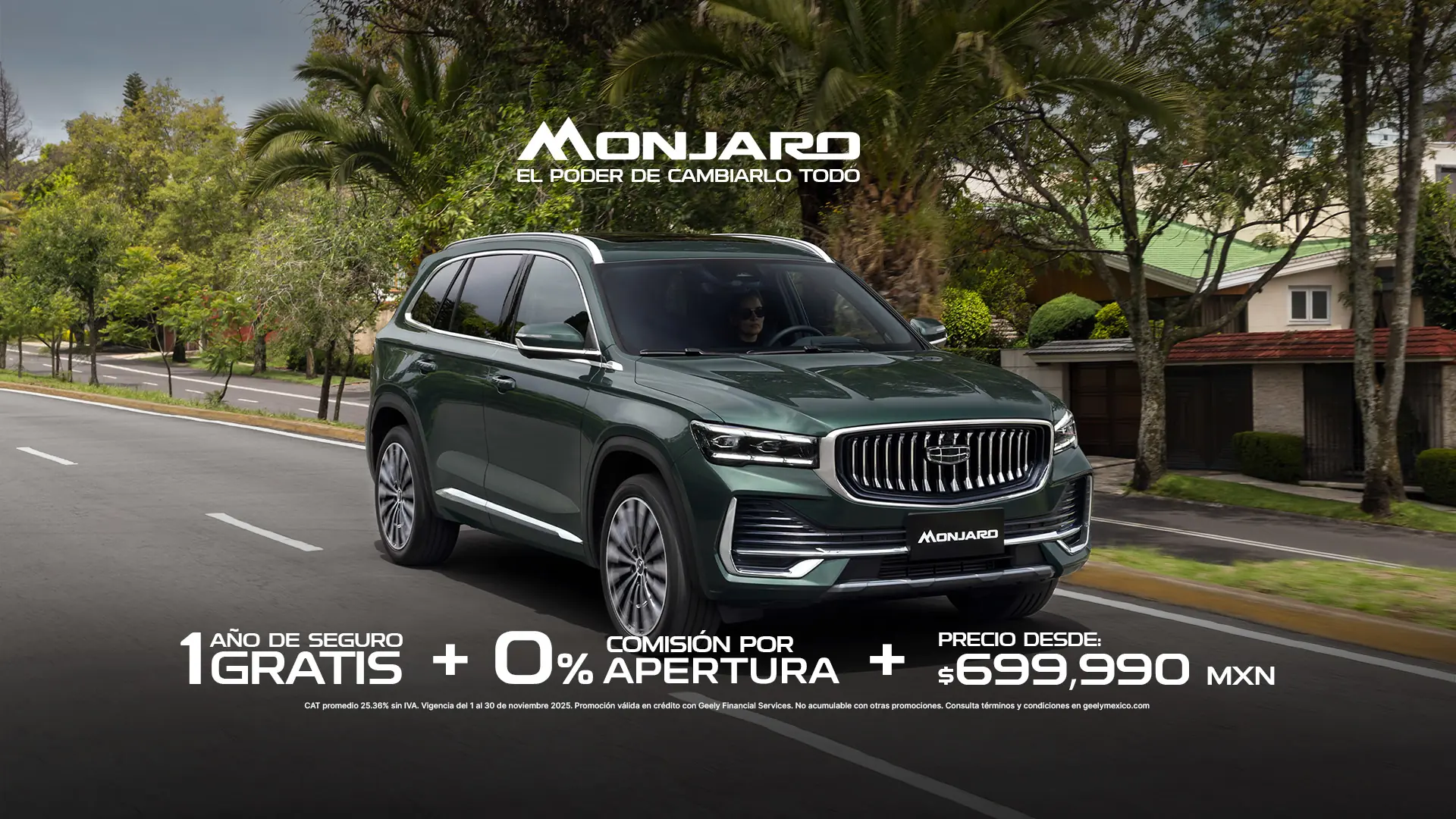 El año de seguro gratis aplica únicamente para el modelo Monjaro 2026 en su versión GF, en operaciones de crédito a través de Geely Financial Services (BBVA). Válido solo con aseguradoras participantes. Consulta especificaciones y condiciones con tu Distribuidor autorizado Geely. Al finalizar el periodo del seguro gratis, el cliente deberá contratar un seguro conforme a lo señalado en su contrato de crédito.