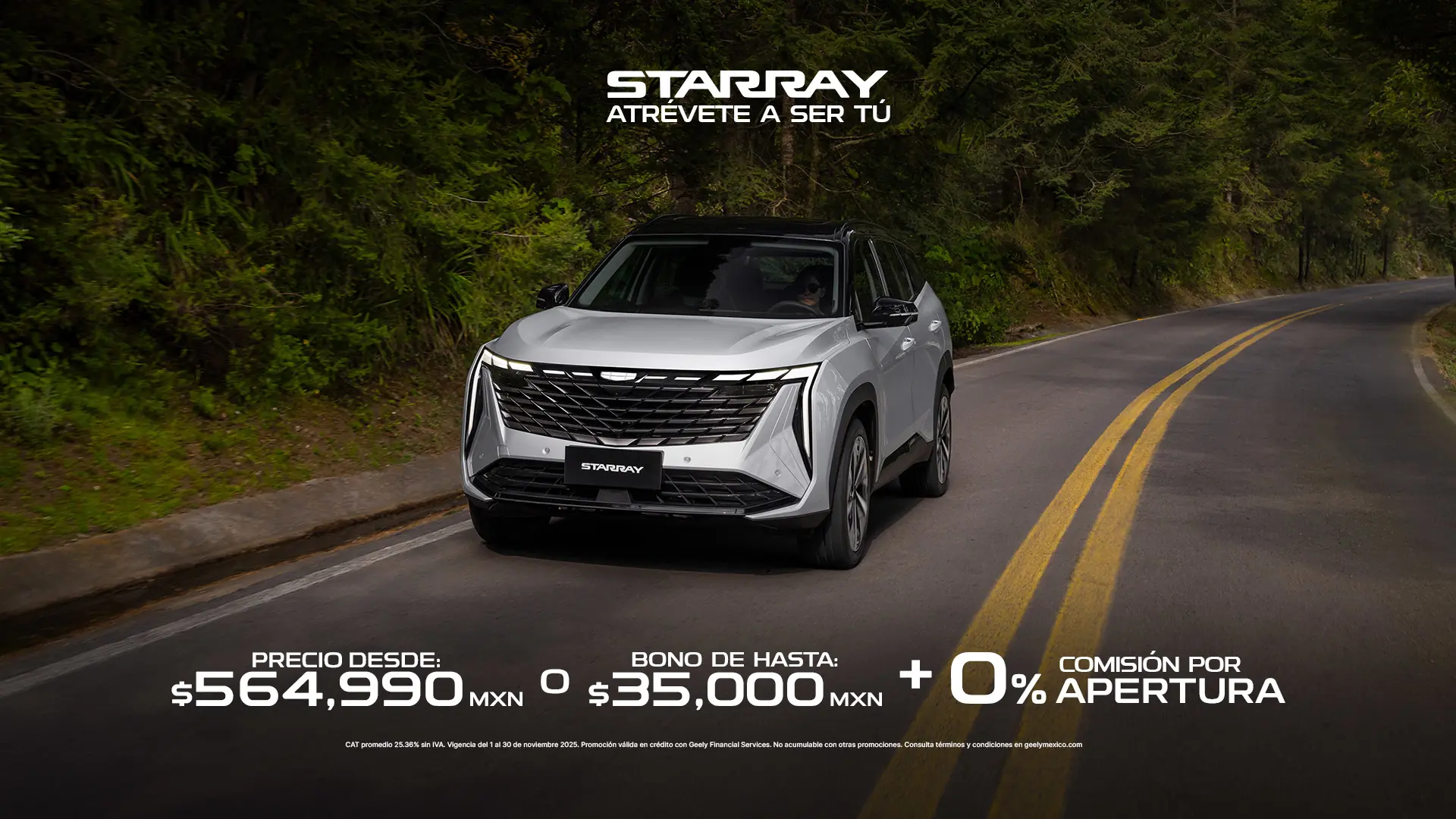 El precio especial de $564,990 MXN aplica al utilizar el bono de $35,000 a precio. Aplica únicamente a través de Geely Financial Services (BBVA México S.A., Institución de Banca Múltiple), para el modelo Starray 2025 en su versión GL 2.0T, sobre un precio de $599,990 MXN bono aplicado a precio es de $35,000 MXN (IVA Incluido no aplica seguro por un año gratis, y no es acumulable con otras promociones. Aplica 2.5% de comisión por apertura en plan BASE o 0% Comision por apertura utilizando el plan BUEN FIN